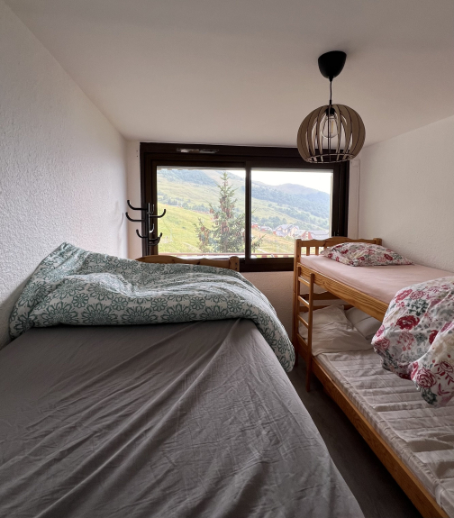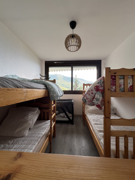 Segundo dormitorio con 4 camas separadas por dos literas de 90x190, dos cómodas. Ventana de persiana con magnífica vista de la estación.
