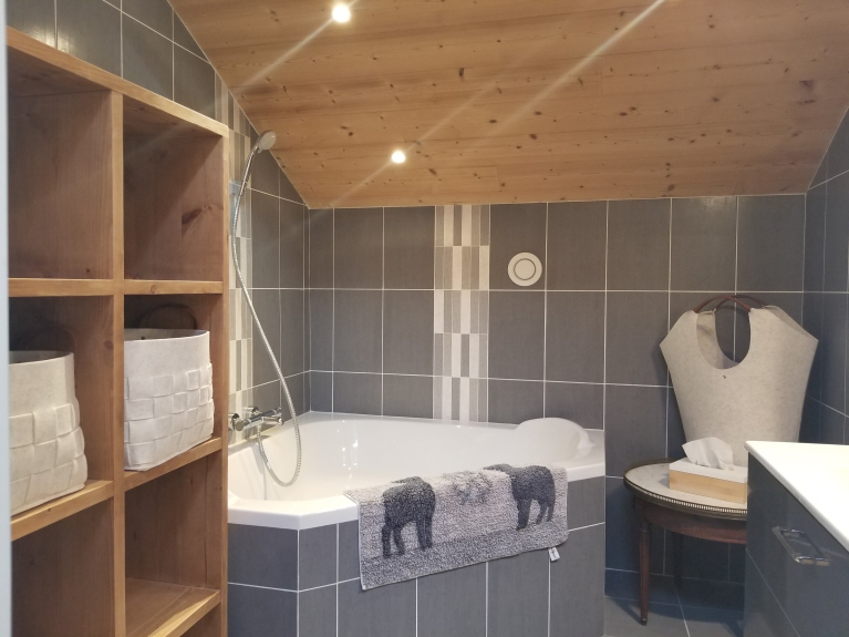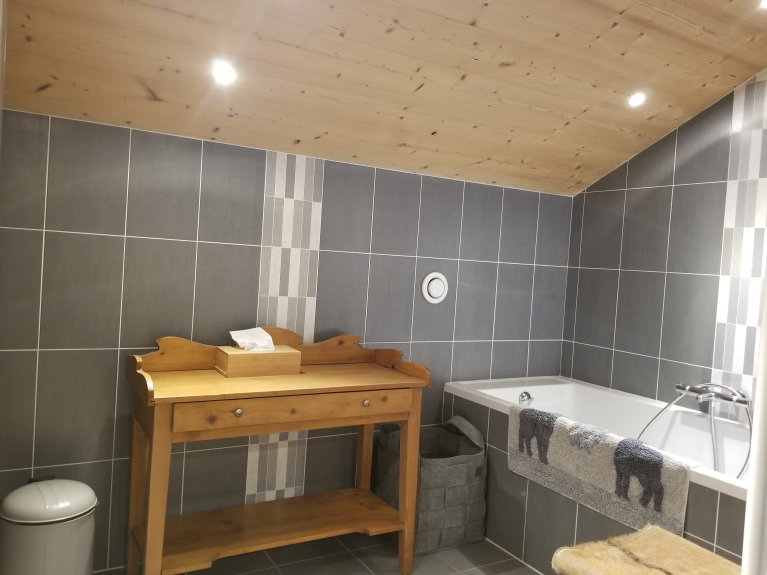 Un primer dormitorio / piso de madera, 14 m², doble o triple equipado con una cama 1m80 x 2m (o 2 camas 90cms x 2m), sillón cama 1 persona 90cms x2m, mesillas de noche, arreglos, sillas y su cuarto de baño semi-abierto / alicatado, 7 m² muy espacioso con bañera, lavabo, espejo, radiador secador de toallas, arreglos y secador de pelo de pared y WC privado independiente.