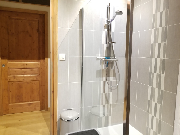 Una segunda habitación dormitorio / suelo de madera, 14 m², para 3 a 5 personas, camas 90cms x 2m, sillas, velux y su cuarto de ducha / suelo de baldosas, 5 m², con ducha italiana muy espaciosa, lavabo, espejo, espacio de almacenamiento, radiador toallero y secador de pelo de pared.