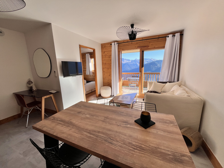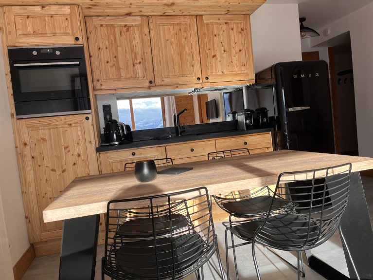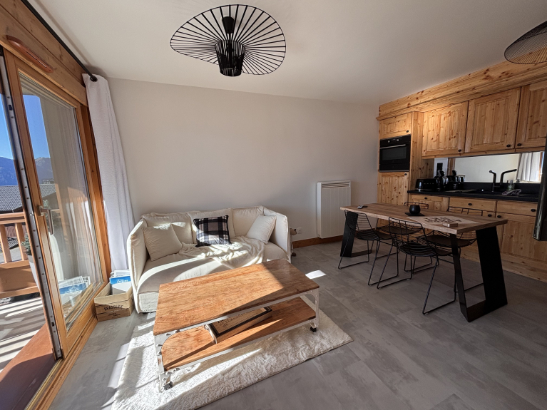 Un gran salón-cocina orientado al sur con vistas ininterrumpidas a las montañas de Beaufortain y al Mont Blanc