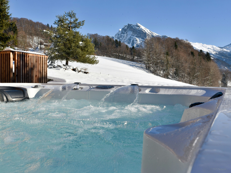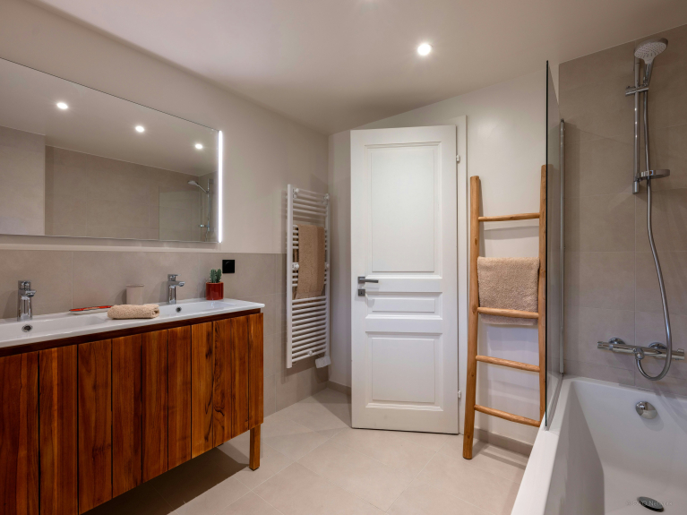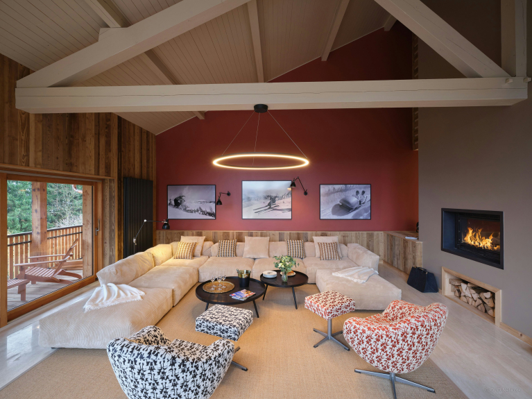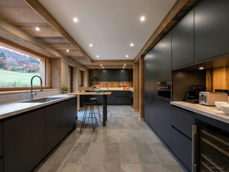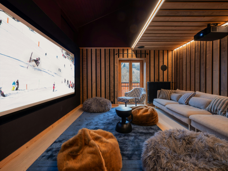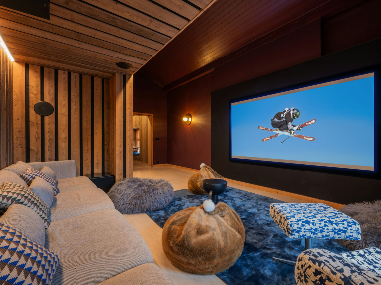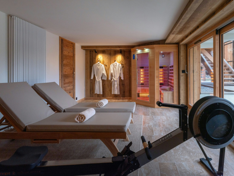 La sauna y el resto de la zona de bienestar se encuentran en la planta baja, junto a la sala de esquí y la lavandería. El garaje doble, equipado con un cargador para coches eléctricos, también puede alojar sus bicicletas, y tres vehículos adicionales pueden aparcarse en el exterior.