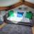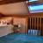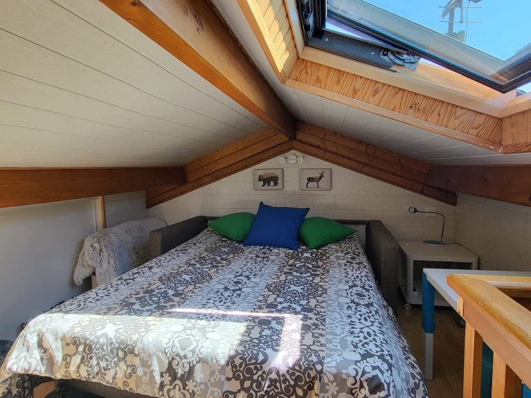 Primera planta: dormitorio/mezzanine (4) con gran ventana velux. Sofá cama 140cm, rincón TV.
