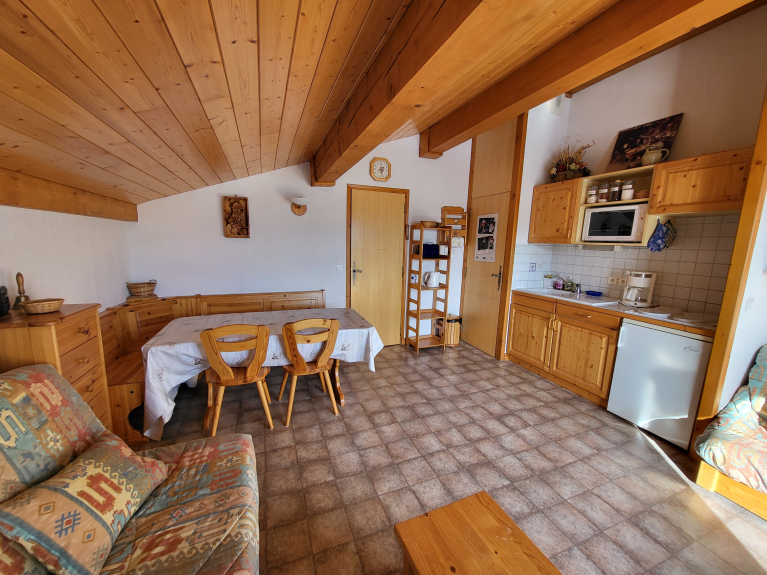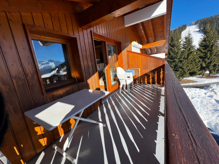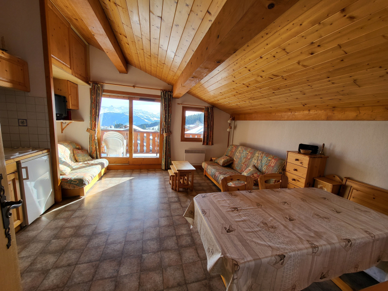 Situado en la última planta, consta de 2 habitaciones dobles + salón/cocina con 2 sofás cama + balcón de 8m2 orientado al sur con magníficas vistas a la Pierra Menta y al macizo de Beaufortain. Cuarto de baño y WC separados. Aparcamiento exterior privado gratuito + guardaesquís privado.