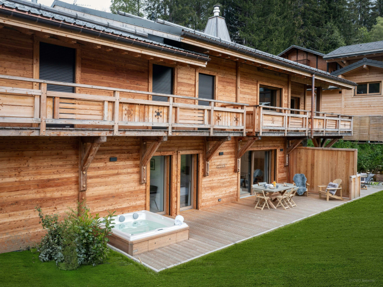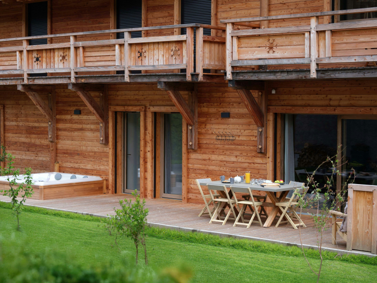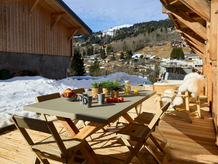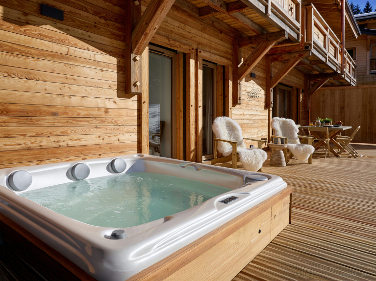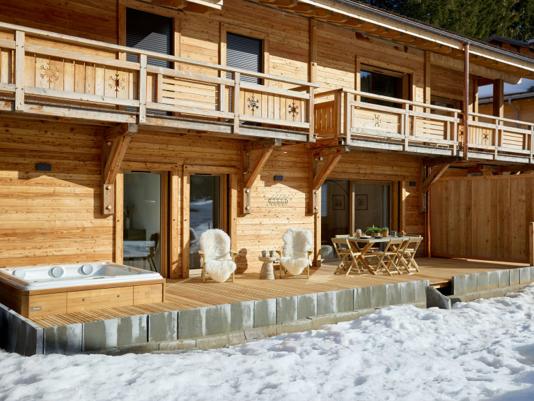 Aunque no tiene las mejores vistas, la terraza es un lugar estupendo para disfrutar del sol y del aire alpino. Está amueblada con una segunda mesa de comedor, tumbonas y una bañera de hidromasaje, que sin duda será un punto culminante de su estancia en los Alpes.
