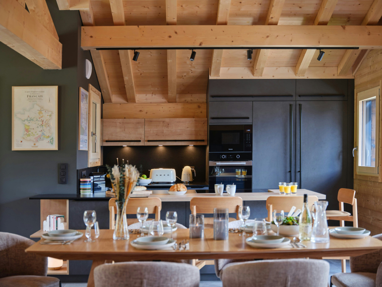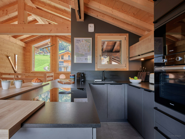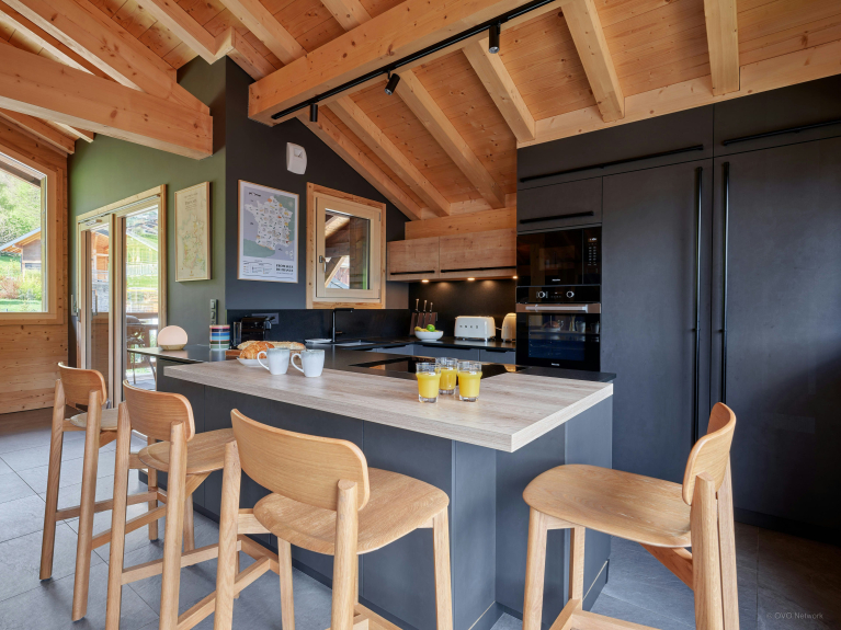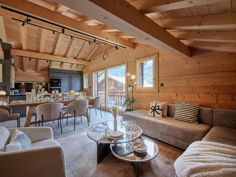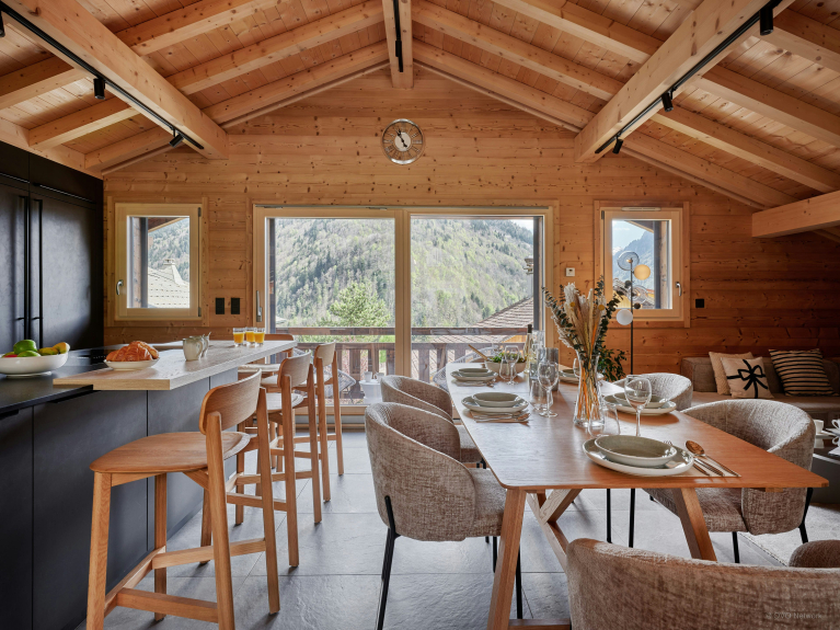 En la planta superior, la sala de estar, con su hermosa estructura de tejado a la vista, aprovecha al máximo la luz y las espléndidas vistas de las montañas y la estación de Avoriaz. El salón, con sofá esquinero y televisor, está separado de la cocina totalmente equipada por una mesa de comedor.