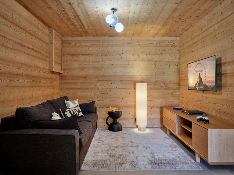 En la planta inferior hay una sala de TV con una consola PlayStation, así como una sala de esquí muy funcional equipada con secador de botas calefactado, lavadora, secadora, equipo de reparación de bicicletas y un tablero de dardos.