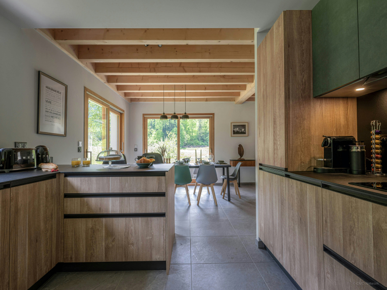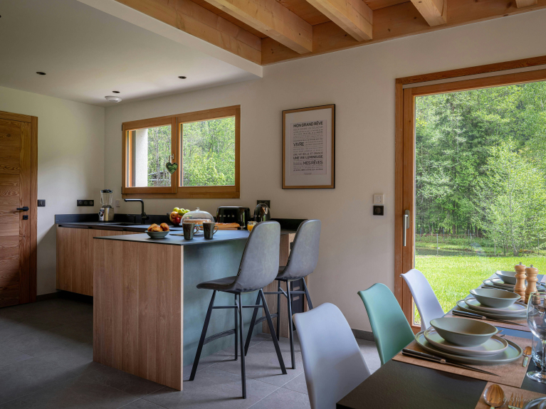 La amplia zona de estar incluye un acogedor salón con sofá, televisor y estufa de leña, una mesa para comer con la familia y los amigos, y una cocina americana bien equipada. Ésta incluye una placa de inducción y una encimera ideal para compartir un café, y da acceso a un lavadero con lavadora y secadora.