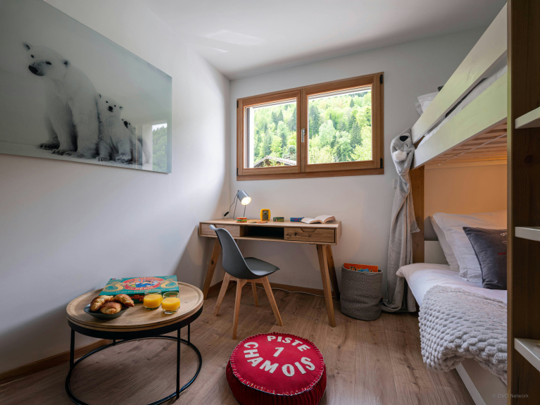 También hay un dormitorio infantil con literas y escritorio en la planta baja, y un cuarto de ducha con aseo.