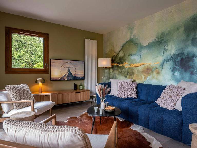Podrá disfrutar del aire alpino desde la terraza, que se extiende hasta un pequeño jardín llano. Equipada con tumbonas y una segunda mesa de comedor, invita a relajarse, sin dejar de mirar a la zona de césped.