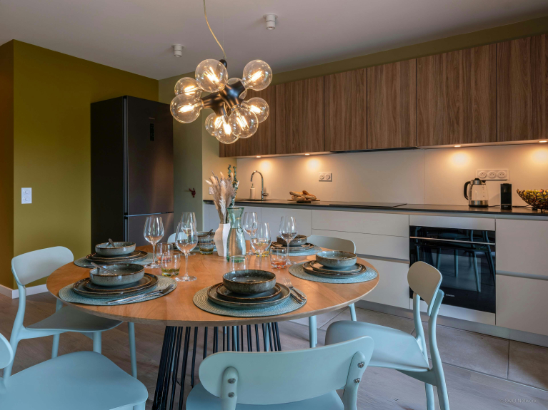 El luminoso y acogedor salón cuenta con una acogedora sala de estar con sofá, sillones y televisión, una bonita mesa redonda para seis personas para compartir las comidas y una moderna cocina totalmente equipada.