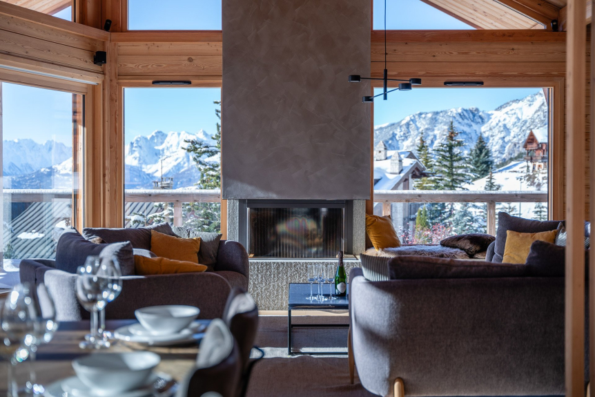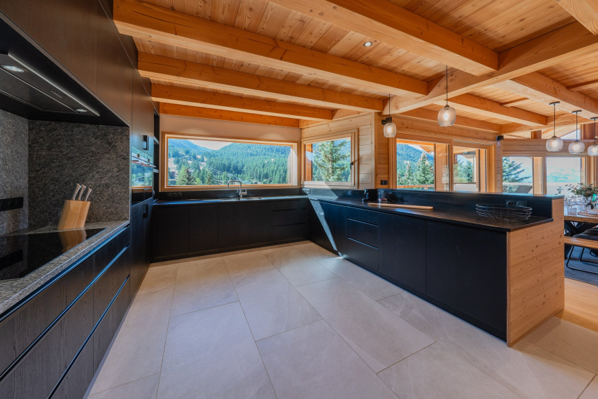 En la planta principal, la cocina totalmente equipada se abre a una impresionante vista del Monte Janus, un panorama del que nunca se cansará.