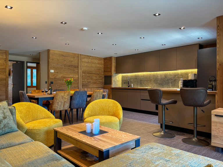Luminoso salón con comedor y dos balcones con vistas a las laderas de La Rosière