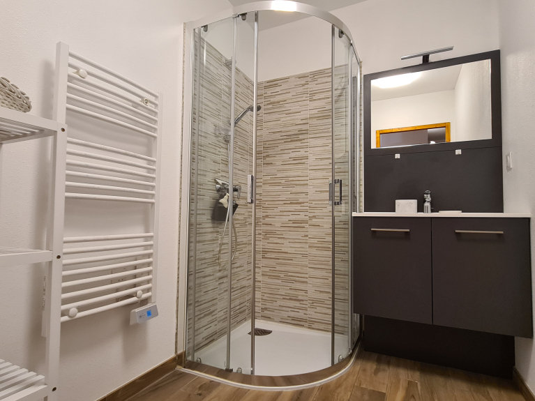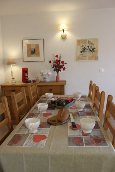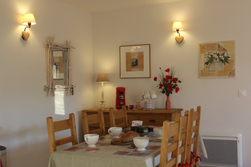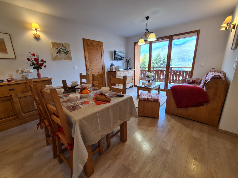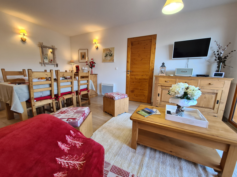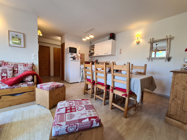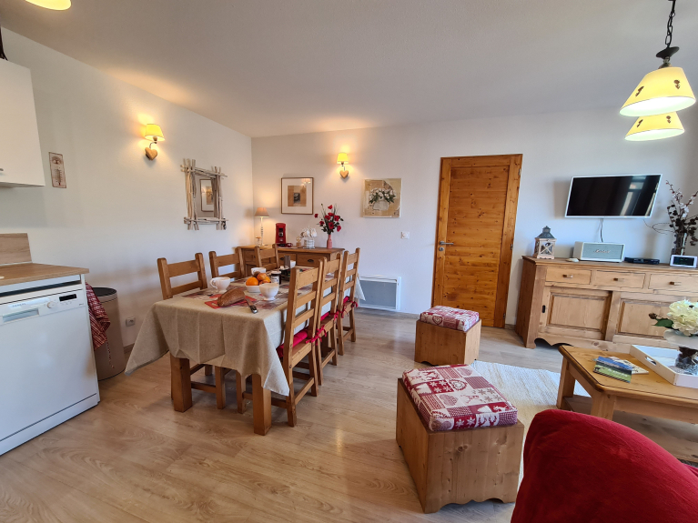 Este apartamento está totalmente equipado, con una cocina completa que incluye horno, vitrocerámica, nevera/congelador grande de 150 L, máquinas de raclette y fondue. Se abre a la luminosa sala de estar y a la terraza de más de 11m².