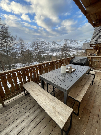 Agradable terraza amueblada (mesa y barbacoa) con vistas panorámicas despejadas a la montaña,
