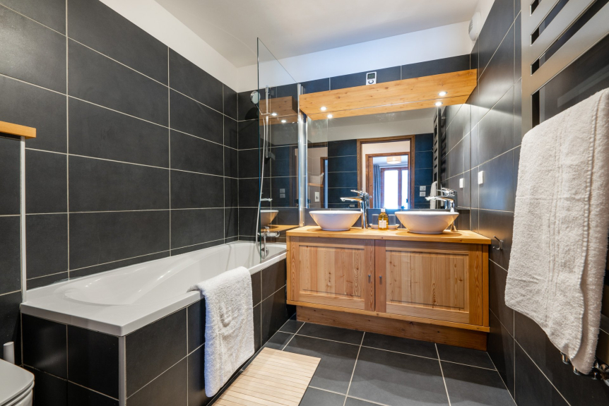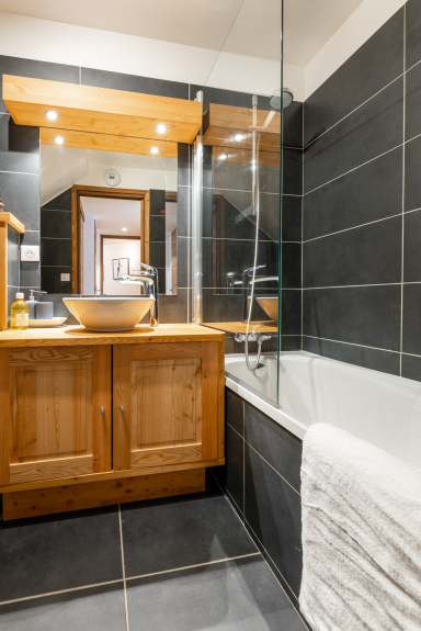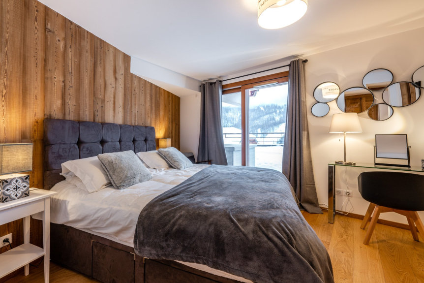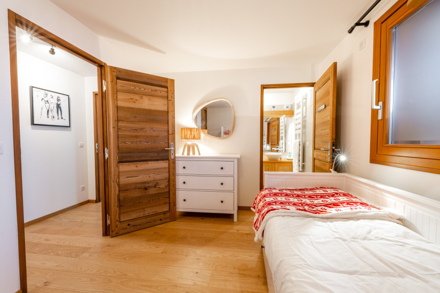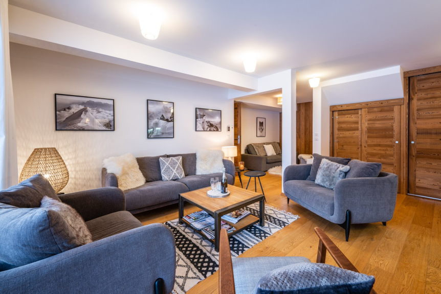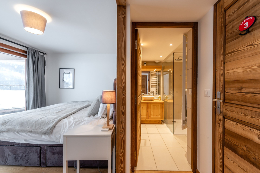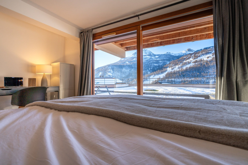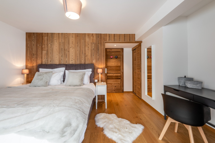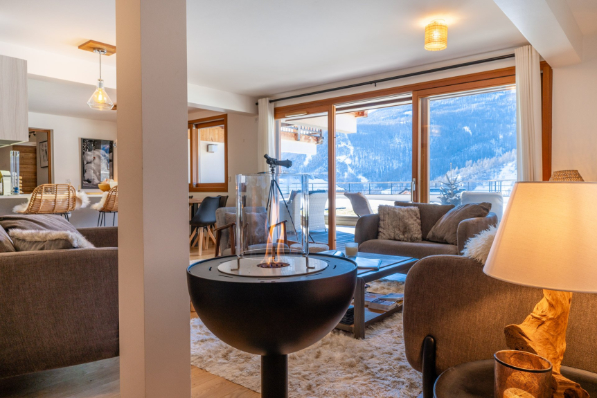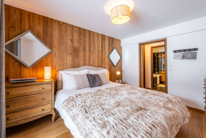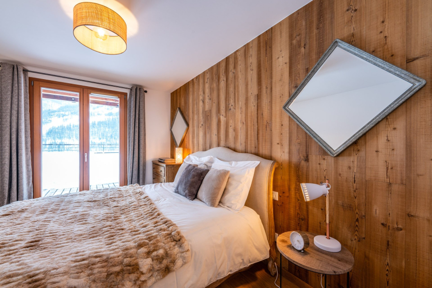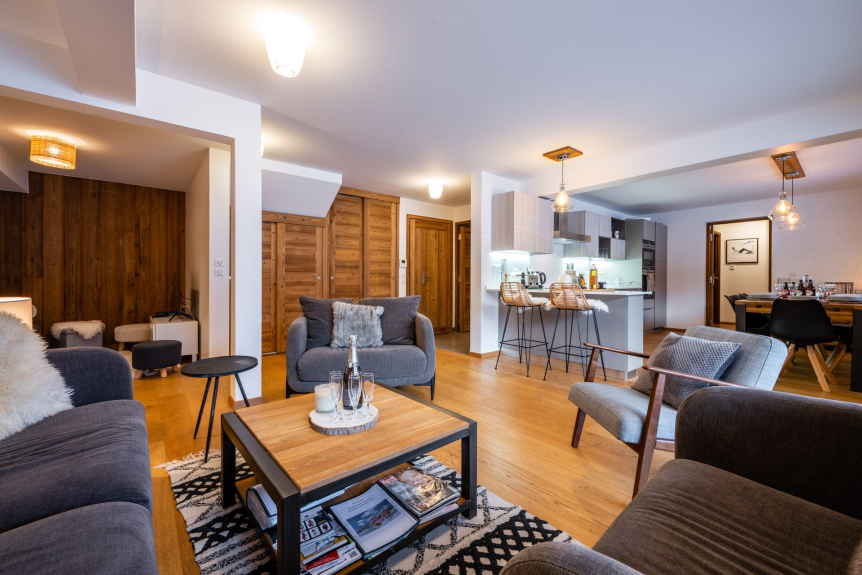 El piso Abela se encuentra en el dominio privado de Les Peyrons, ocupando todo el primer piso de una pequeña residencia chalet recientemente construida en 2018.
