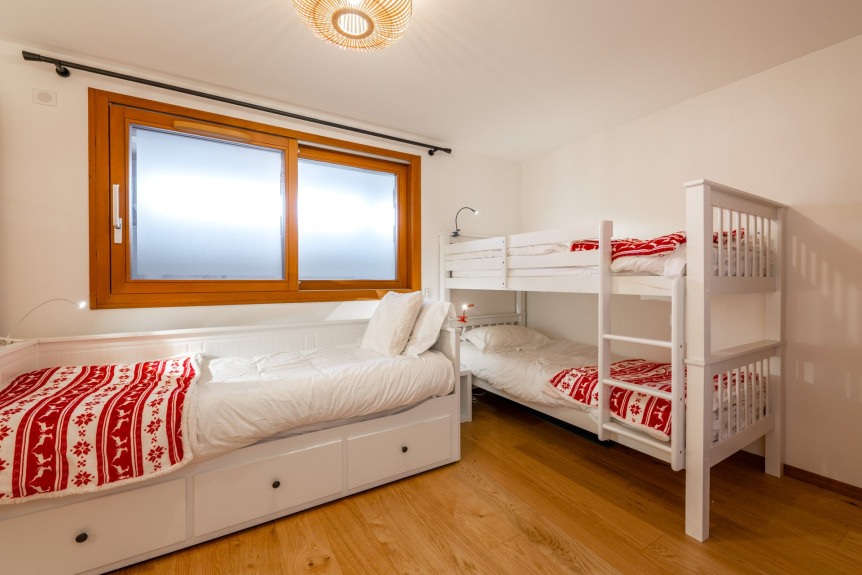 Hay 4 dormitorios, cada uno con su propio cuarto de baño. 3 de ellos tienen camas king-size (180cm) y acceso directo a la terraza con sus sublimes vistas. El cuarto dormitorio es flexible y tiene 4 camas individuales (1 cama-nido y 1 litera).