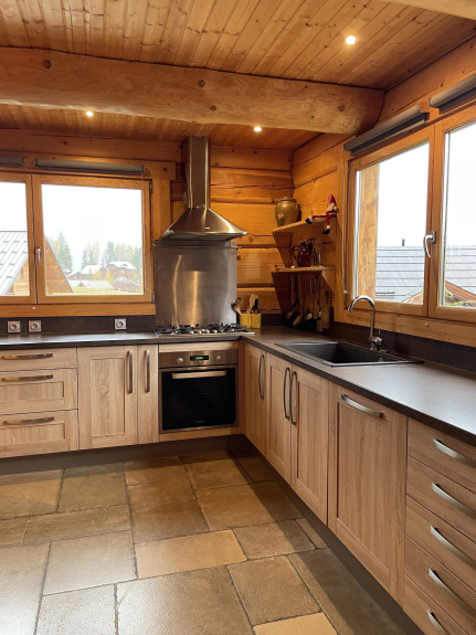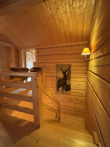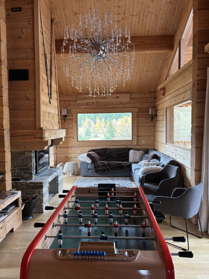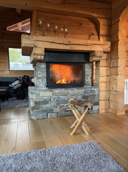 Este auténtico chalet de troncos tiene más de 300 m² repartidos en 3 niveles.