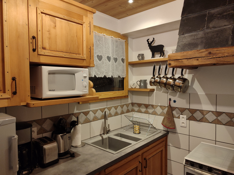 congelador, batidora, olla a presión, tostadora, máquina de raclette y fondue, hervidor eléctrico y toda la vajilla necesaria.