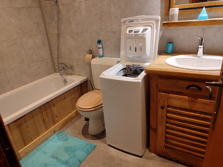 UN BAÑO: con una bañera, un aseo, una lavadora, un secador de pelo.