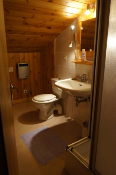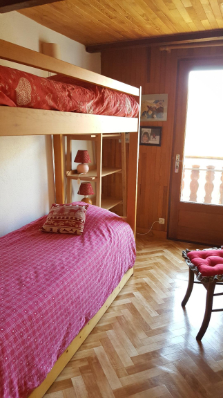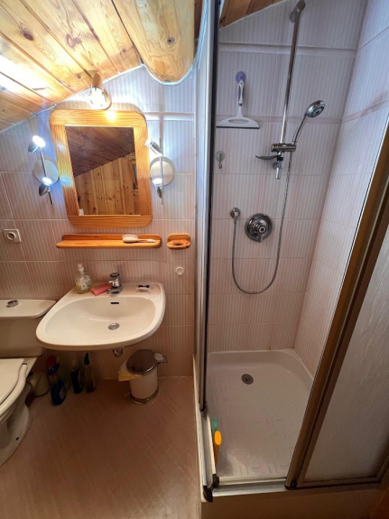 1ª planta: 1 dormitorio con cama de 120 cm, y un pequeño dormitorio con literas + cama extraíble, baño, WC separado.