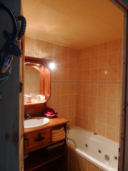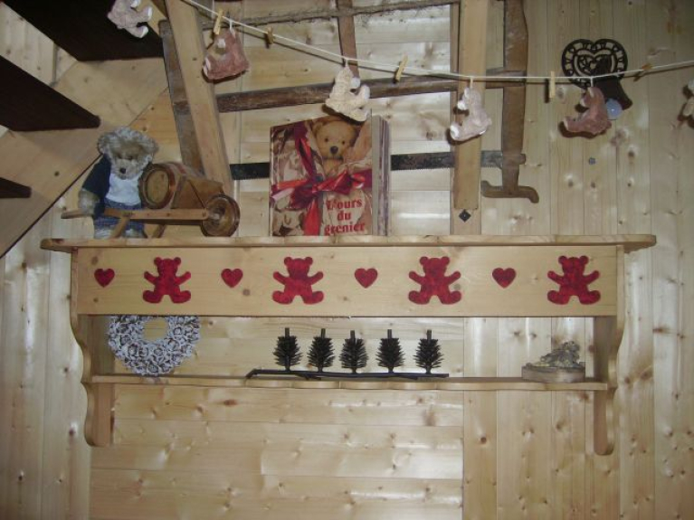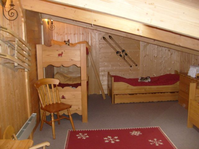 Cuarto de baño con bañera de hidromasaje, 2 dormitorios en la primera planta, uno equipado con una cama doble tipo "chalet" y otro para niños con 6 camas individuales.