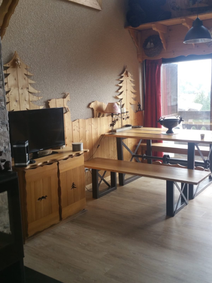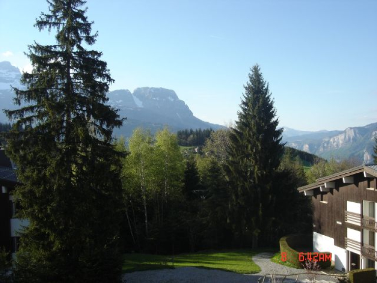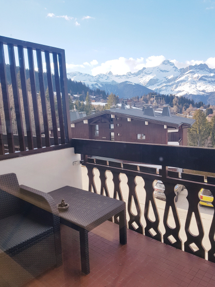 Totalmente equipado, ideal para familias. Salón con terraza y vista sobre el Aravis.