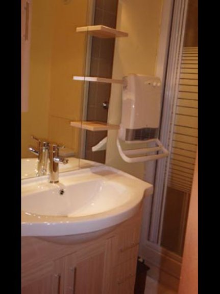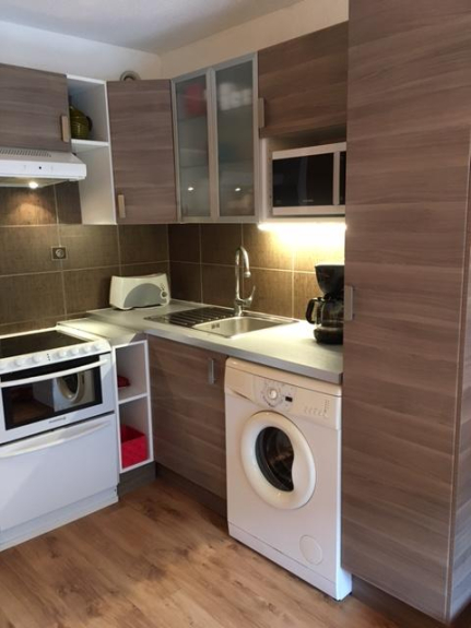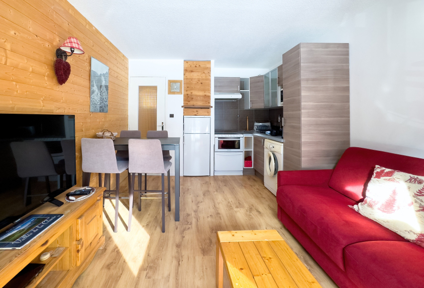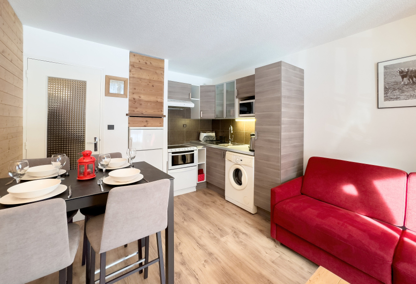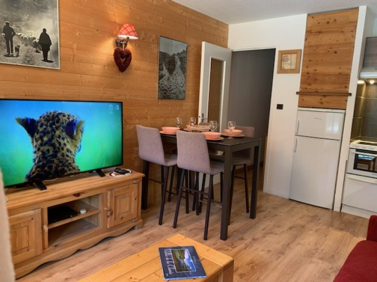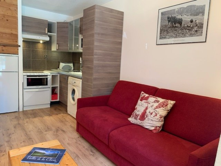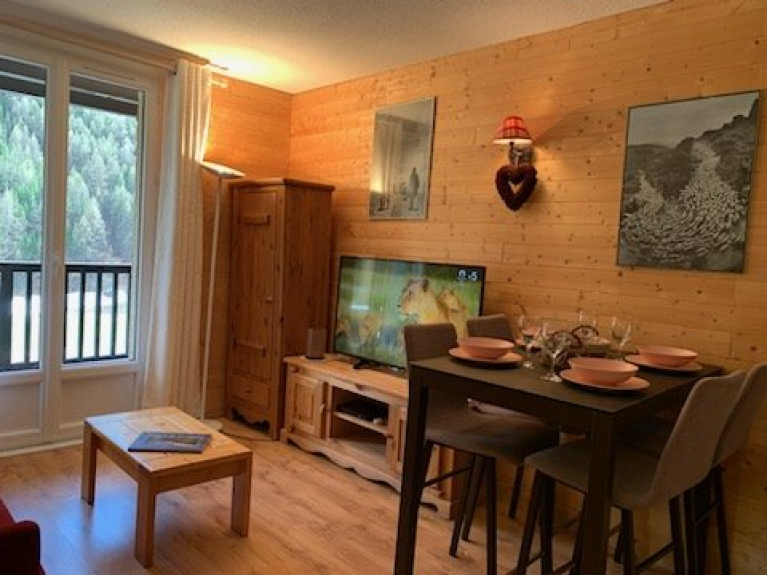 Salón con cocina, 1 dormitorio con 2 camas individuales (80cm) convertibles en cama doble (160cm), baño con ducha, lavabo e inodoro, balcón orientado al sur con vistas a la montaña, aparcamiento, guardaesquís.