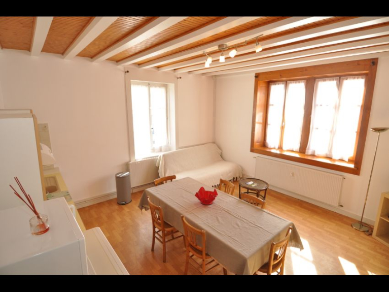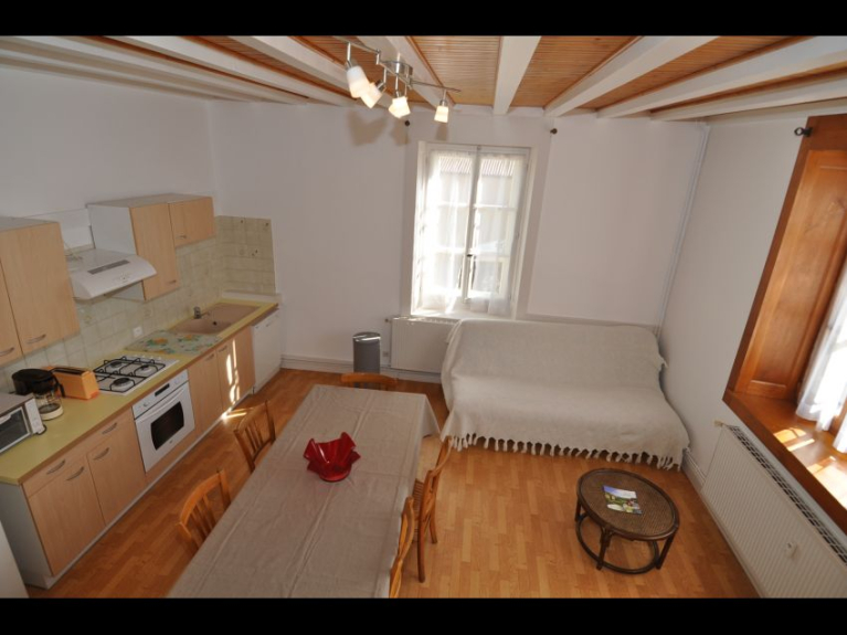 Piso en una casa de pueblo con una superficie de 61m2, compuesto por una sala de estar y una cocina totalmente equipada (lavavajillas, nevera, horno y microondas), un sofá cama para 2 personas y una televisión con TNT.