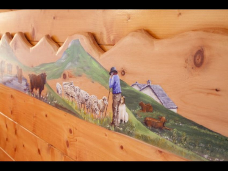 - 1 MEZZANINA GRANDE, de muy fácil acceso, toda en paneles y parquet con su rincón de lectura, su cama de 140 cm muy acogedora, su cómoda y su pequeño escritorio saboyano. Biblioteca con juegos y libros para pequeños y mayores. Decoración típica saboyana con pinturas y fauna.