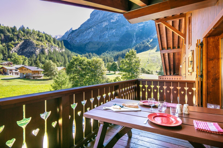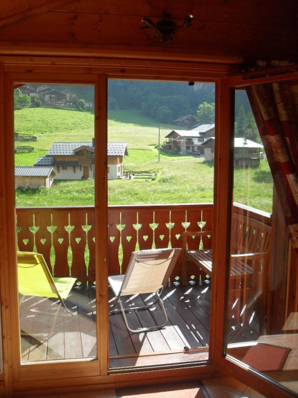 - 1 balcón de madera con una bonita mesa saboyana, bajo el techo.