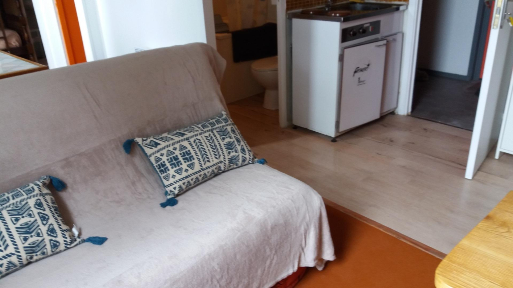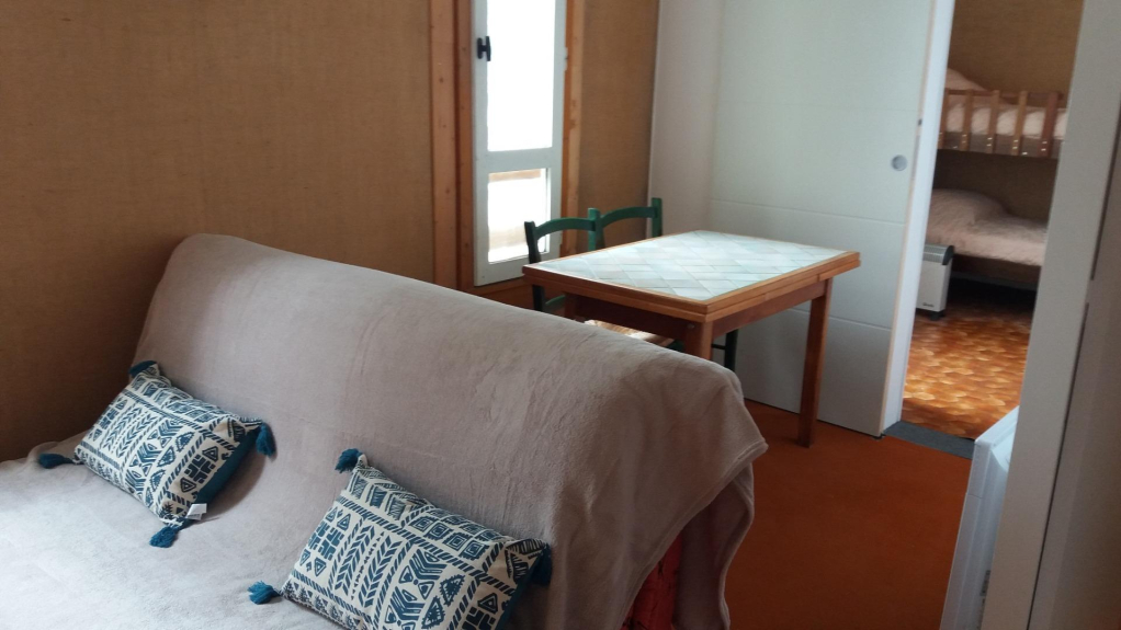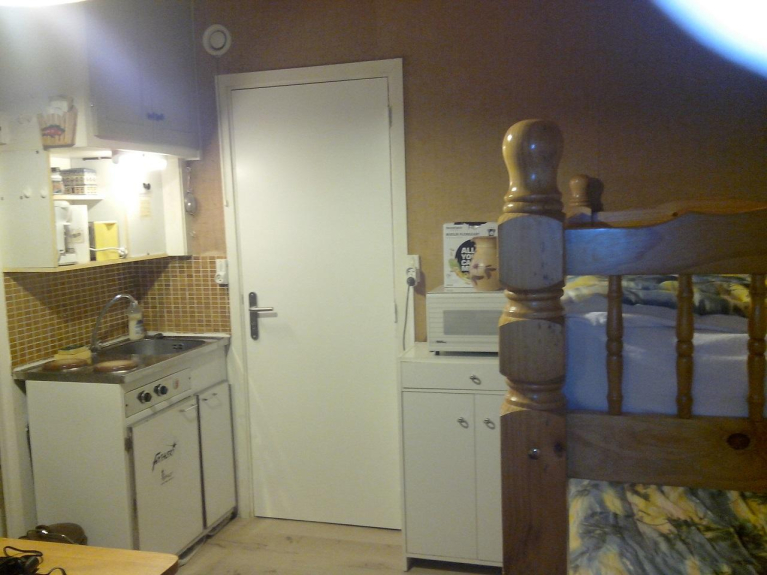- una sala de estar de 16 m² (2 literas + un banco Z - cocina americana - baño - cocina americana con microondas - 2 placas de cocción - armario)