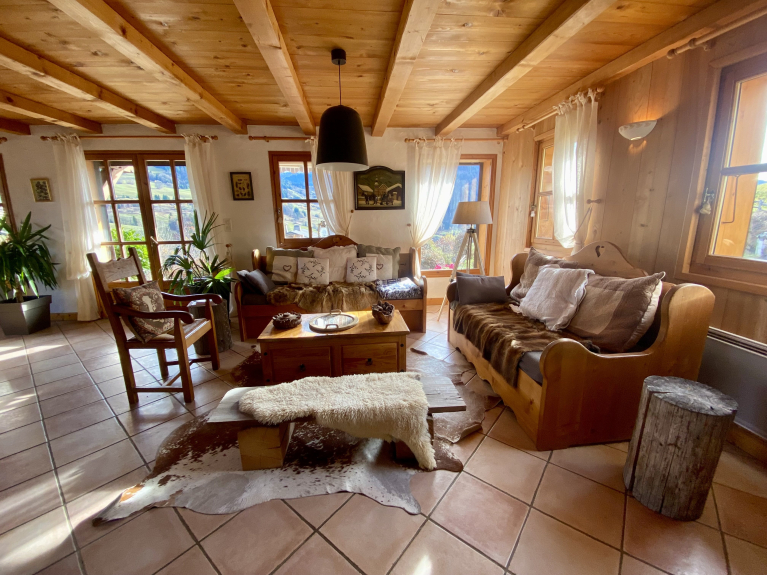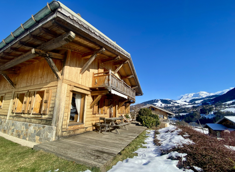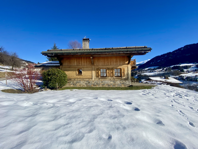 Chalet individual de 137 m2, situado en un entorno rural, a la salida de Megève, en la soleada ladera suroeste, con vistas al Mont Blanc, hacia Praz sur Arly.