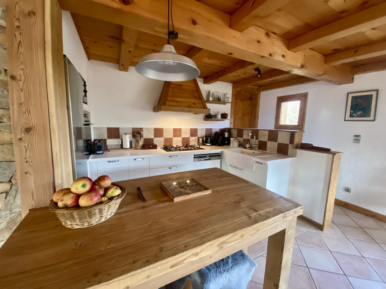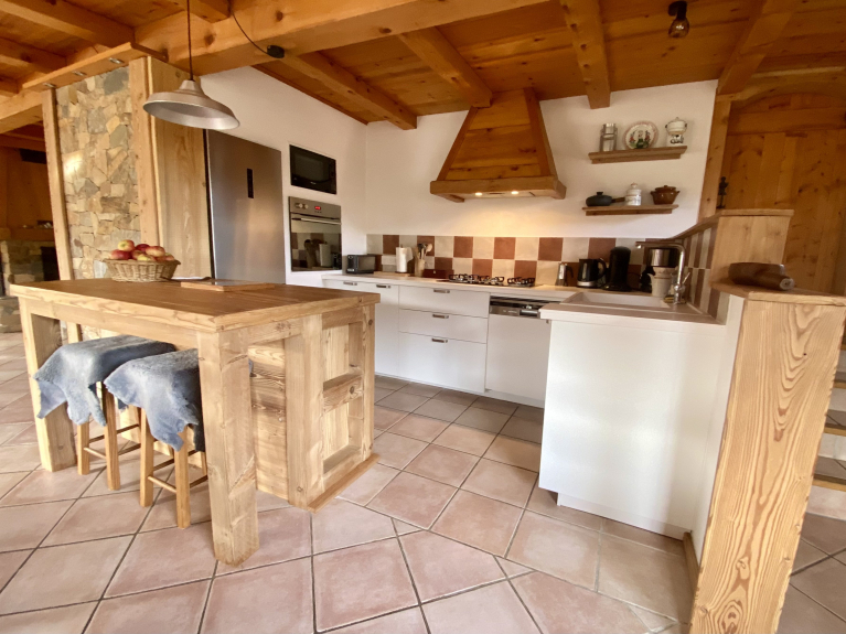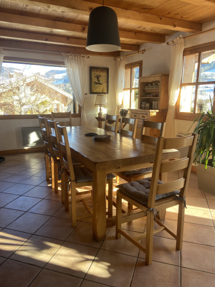 Planta baja: Gran salón de 40m2 (vista del Mont Blanc), chimenea (leña disponible), cocina abierta, cuarto de ducha (ducha italiana), wc separado.