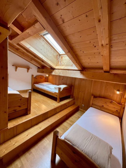 Primera planta: 2 amplios dormitorios de 15 m2 cada uno con balcón orientado al sur, baño (bañera), wc separado, 1 dormitorio para 4 personas.