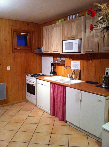 Sala de estar con cocina totalmente equipada a la derecha (nevera-congelador, lavavajillas, microondas, cocina de gas con 3 quemadores de gas y uno eléctrico, horno eléctrico)