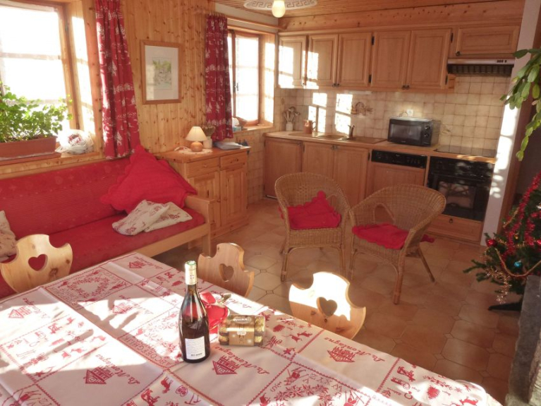 Magnífico chalet tradicional de piedra cubierto de tejas, soleado, tranquilo. Salón muy cálido y luminoso con cocina integrada.