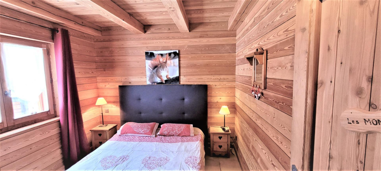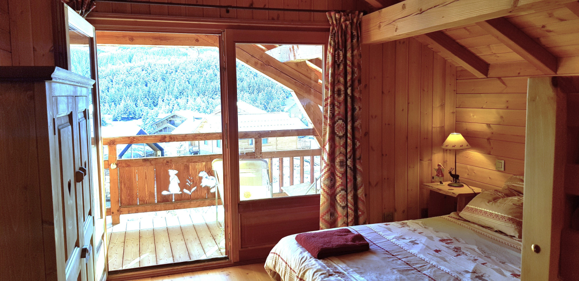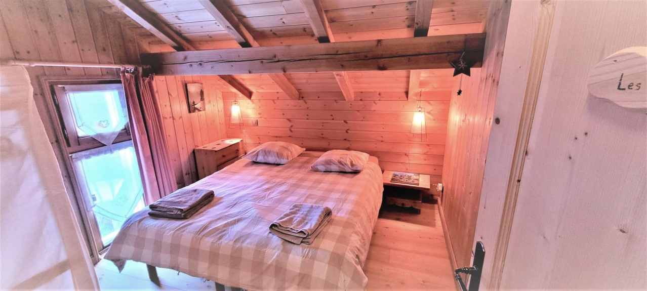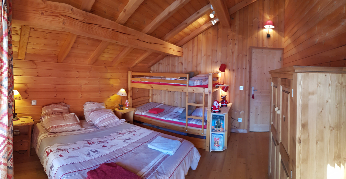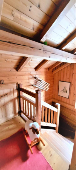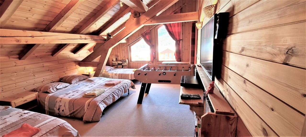 Lado nocturno : 1 dormitorio en la planta baja con baño en suite y WC, y 3 dormitorios en la planta superior con 1 baño y 1 WC. Ropa de cama de calidad. La gran habitación de la primera planta (26m²) es un paraíso para los niños y adolescentes, abierta a la montaña, con un home cinema y un futbolín. 2 habitaciones se abren a un balcón equipado con tumbonas.