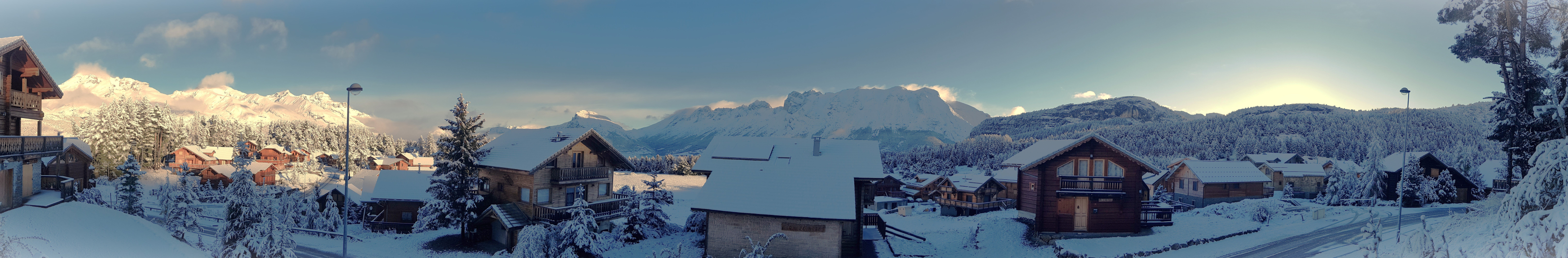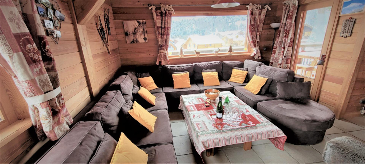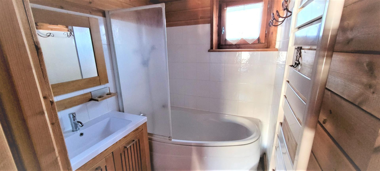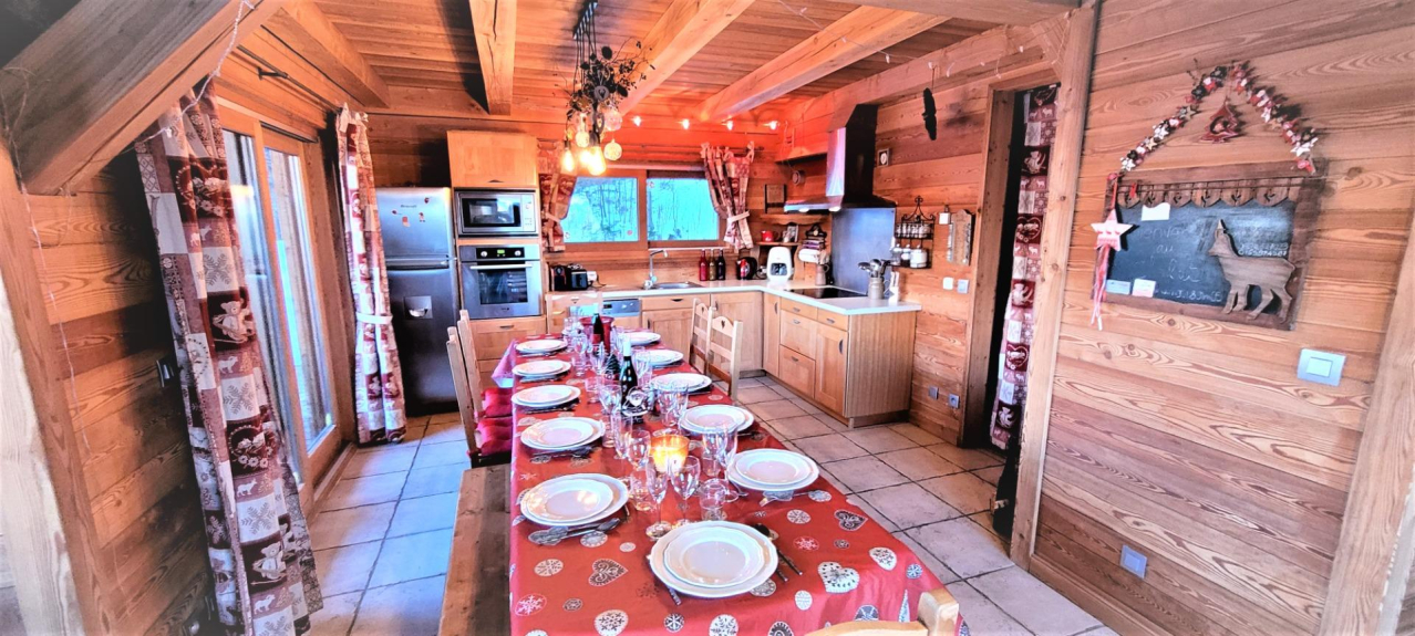 Lado nocturno : 1 dormitorio en la planta baja con baño en suite y WC, y 3 dormitorios en la planta superior con 1 baño y 1 WC. Ropa de cama de calidad. La gran habitación de la primera planta (26m²) es un paraíso para los niños y adolescentes, abierta a la montaña, con un home cinema y un futbolín. 2 habitaciones se abren a un balcón equipado con tumbonas.