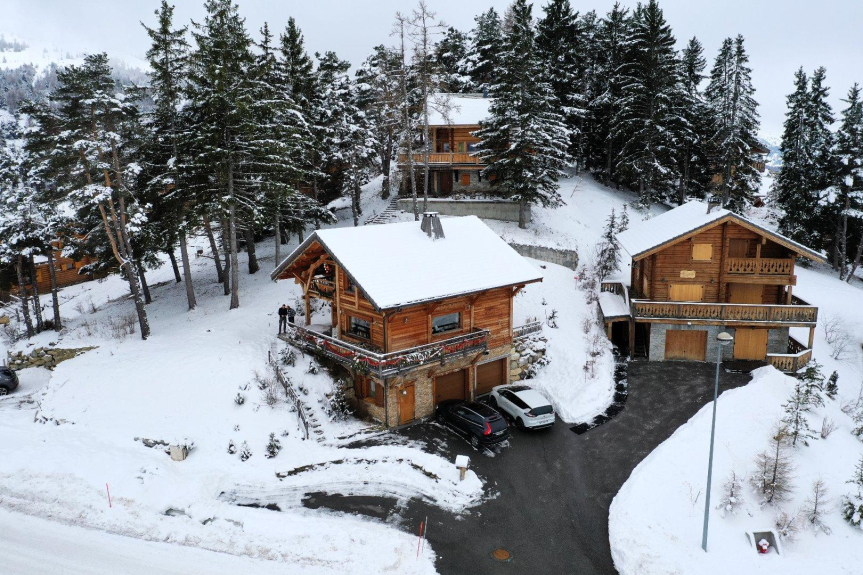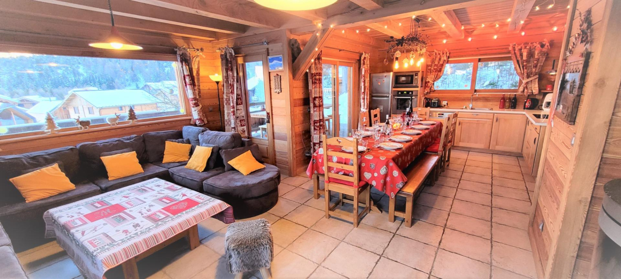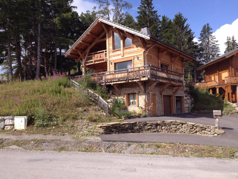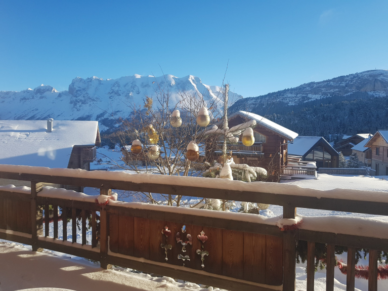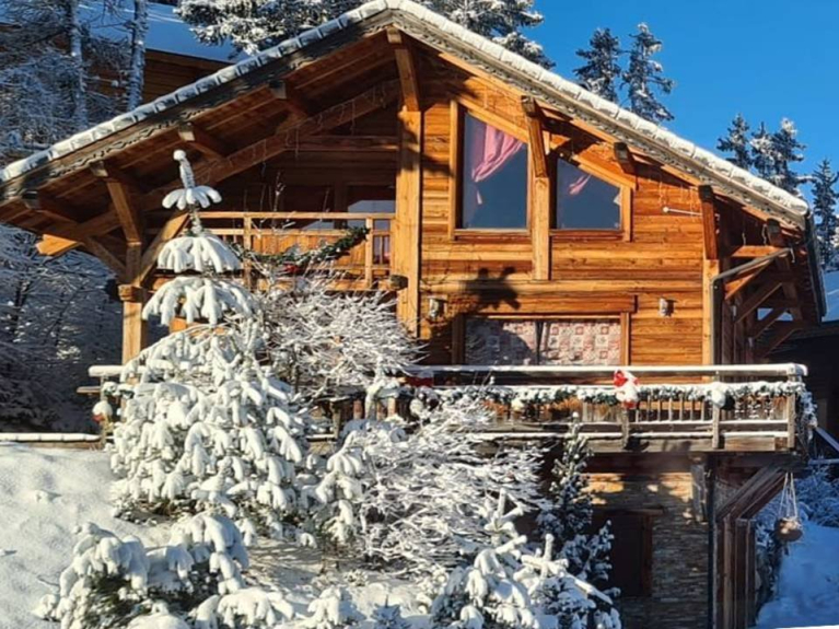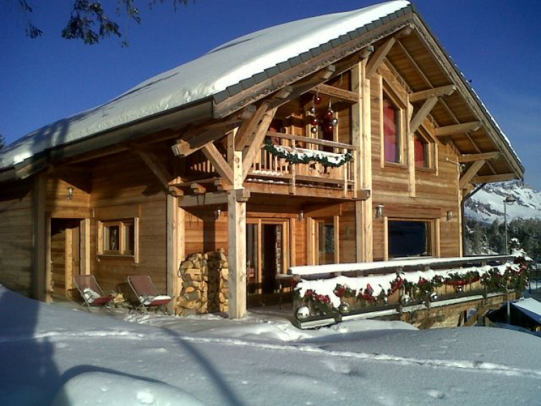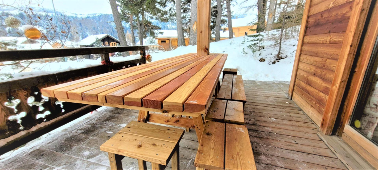 Chalet tradicional de madera de alerce cerca de las pistas y de las tiendas, terraza con vistas a las cumbres. En invierno se puede volver esquiando al chalet.