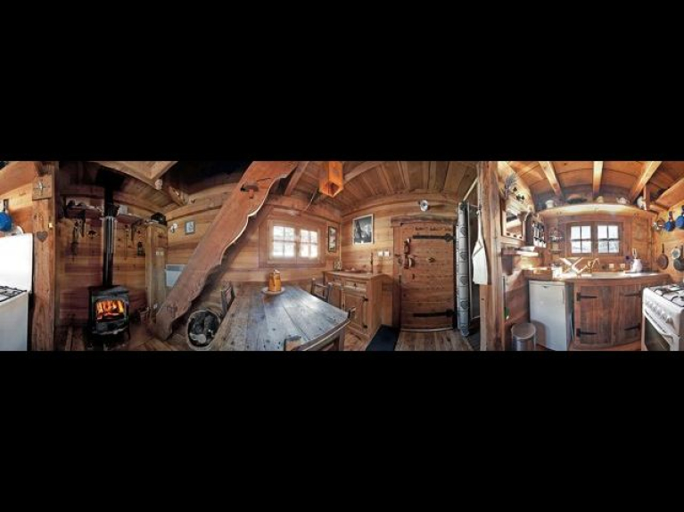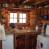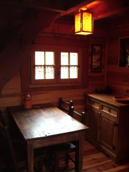 Ambiente cálido e íntimo en este pequeño chalet de madera construido según el modelo de los mazots suizos; superficie habitable: 22 m2
