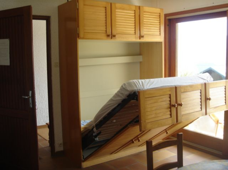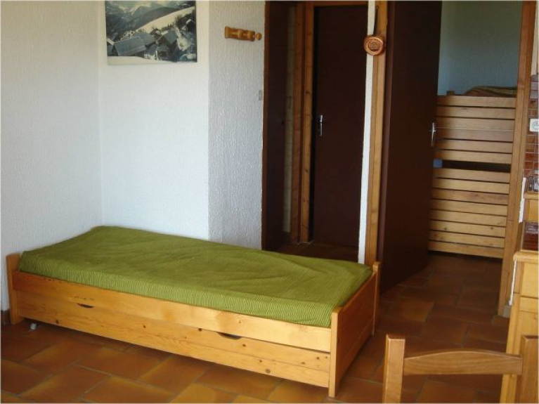 Una cama individual está presente en la sala de estar, también es un sofá.
