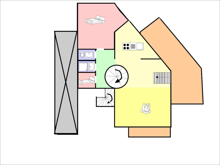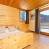 El amplio y luminoso comedor con zona de estar y chimenea se encuentra en la 2ª planta, al igual que la cocina americana. También hay un dormitorio doble con cama de matrimonio y un pequeño dormitorio individual, así como un cuarto de baño con ducha y lavabo y un WC separado. El salón se abre a una gran terraza con una zona de relajación que cuenta con una sauna y un jacuzzi al aire libre. Esta sauna privada se encuentra junto al jacuzzi e incluye una cabina de sauna para 4 a 6 personas, así como una ducha.