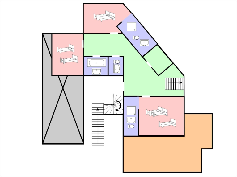 La tercera planta dispone de una acogedora zona de sofás con un gran televisor de pantalla plana. En este nivel también encontrará un dormitorio doble y un dormitorio con 2 camas individuales. Un cuarto de baño con ducha y lavabo y un WC separado.