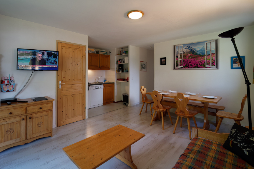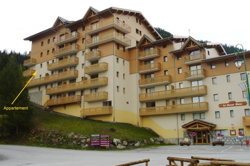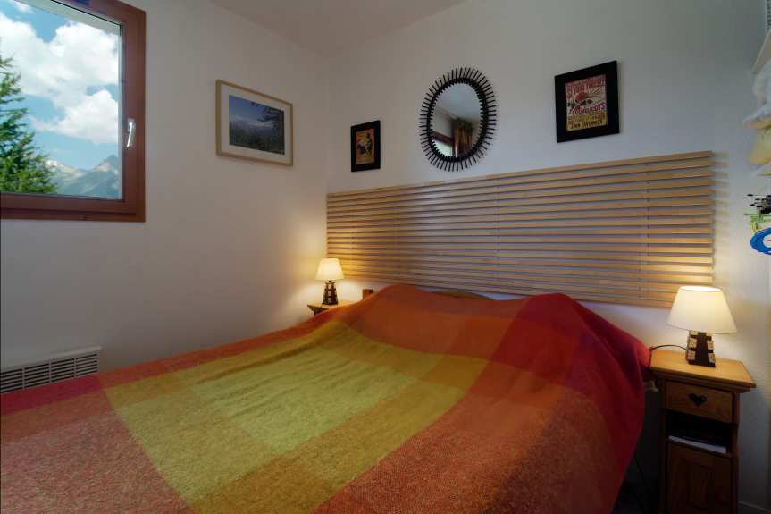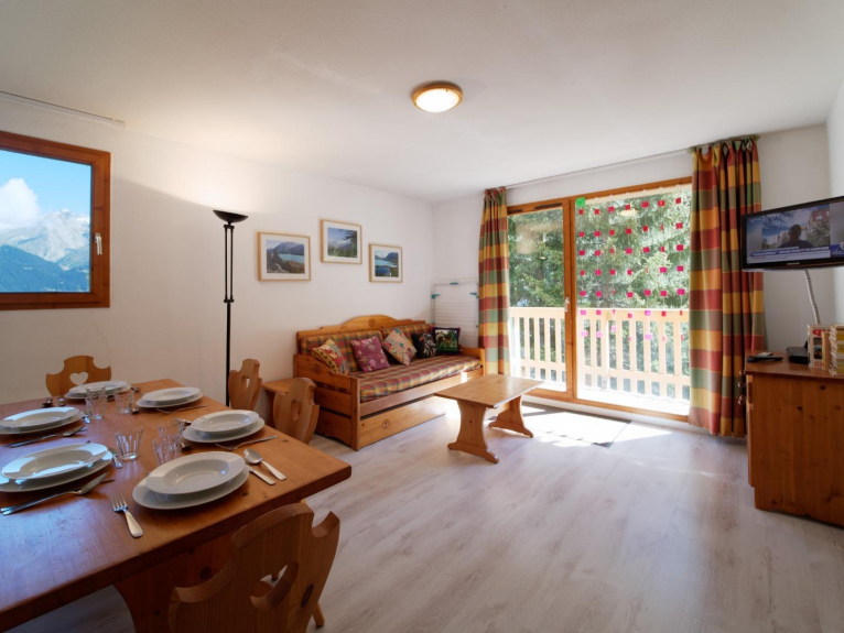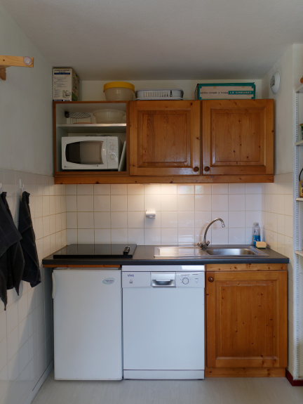 All'entrata del resort, trilocale con 1 camera da letto con 1 letto matrimoniale, 1 cabina (con una finestra e una porta) con 2 letti a castello, 1 soggiorno con un divano letto, angolo cottura con 4 piastre elettriche, frigorifero, forno a microonde multifunzione (grill), lavastoviglie, tostapane, caffettiera, bollitore, set per fonduta, babycook, ecc. 1 bagno con vasca, asciugacapelli e 1 WC separato. In totale, 6 letti e 1 letto per bambini pieghevole sono disponibili (tipo "parapluie"). Balcone con un doppio orientamento e una vista mozzafiato sul massiccio della Vanoise. Wi-Fi gratuito nel resort.