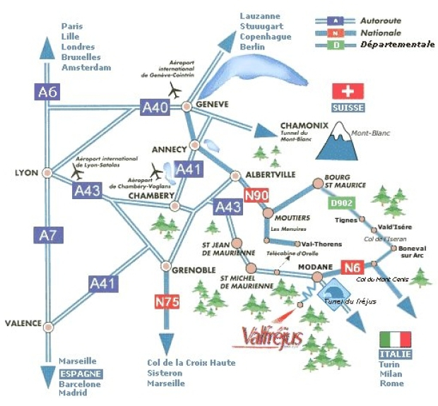 Valfréjus è una stazione a misura d'uomo, a 4 ore da Parigi in TGV e a 1h30 da Torino (stazione di Modane a 8 km, collegamento in autobus sincronizzato con l'arrivo dei treni principali).