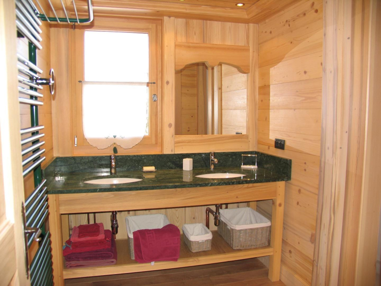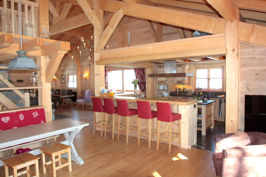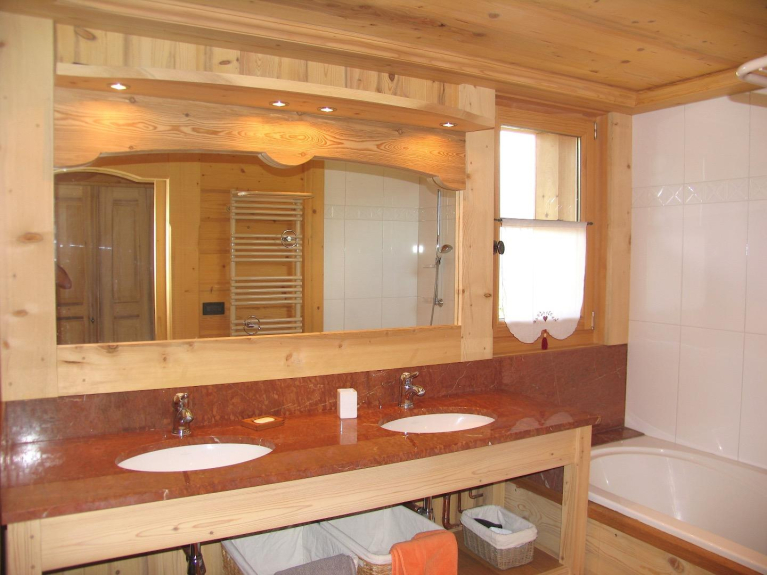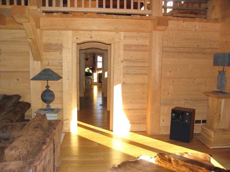 Atmosfera montana e moderna, costruita nella pura tradizione savoiarda, con larice, granito, pavimenti in rovere oliato (anche nei bagni) e rovere spazzolato.