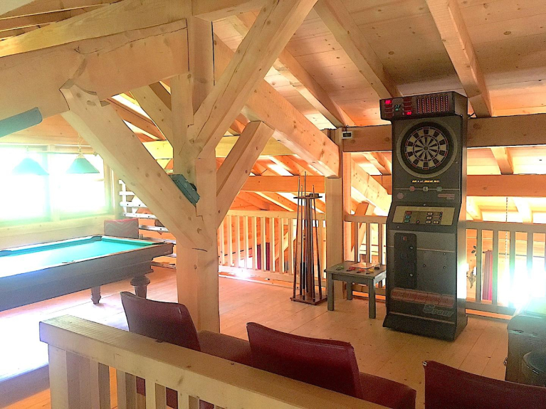 Ampio soggiorno, sala TV, camino centrale (legna fornita), zona colazione, ampia sala da pranzo, cucina a vista con attrezzature di alta gamma, isola centrale e ampio angolo bar, mezzanino con biliardo e freccette come nei pub inglesi, terrazza al piano terra con mobili da giardino in teak, balconi circostanti.