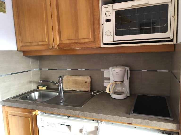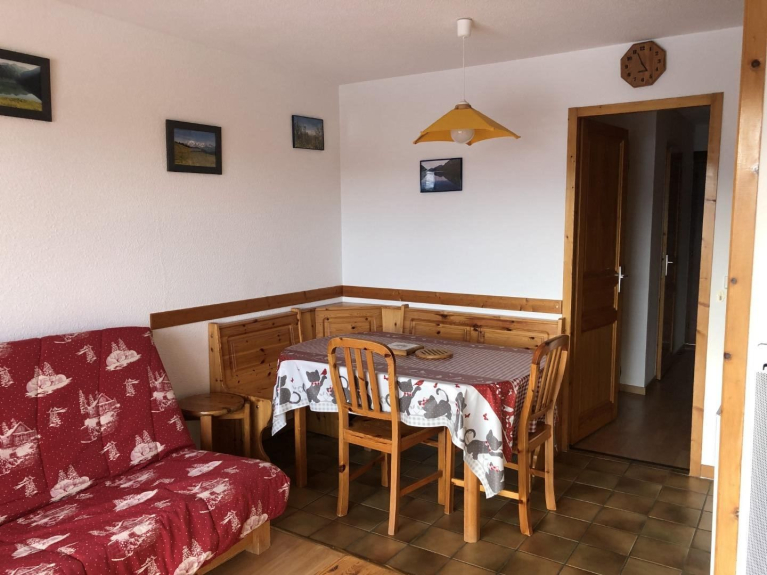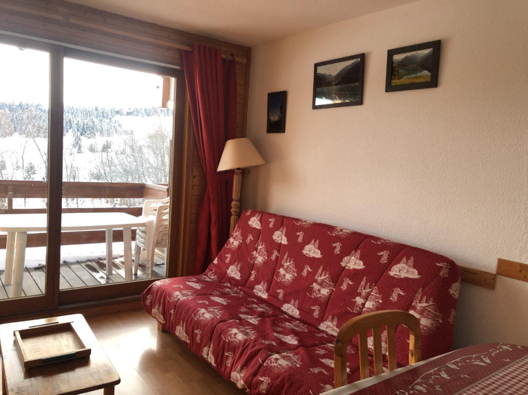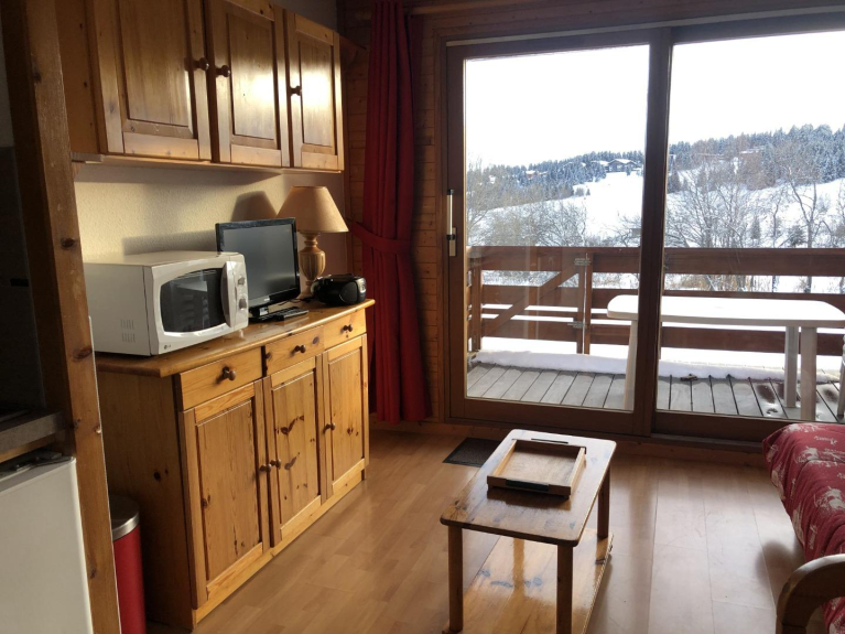 Cabina monolocale affittata, esposta a sud con una magnifica vista sul massiccio del Beaufortain, situata al piano terra, ai piedi delle piste e nel centro della località a 150 m dai negozi.
