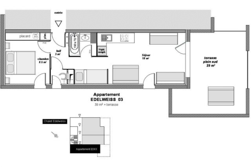 Appartamento di 2 stanze, 4-6 posti letto, in uno chalet di recente costruzione con carattere; soggiorno luminoso; esposizione sud; grande terrazza; ai piedi delle piste. Voto 3***.