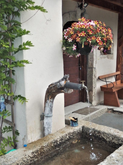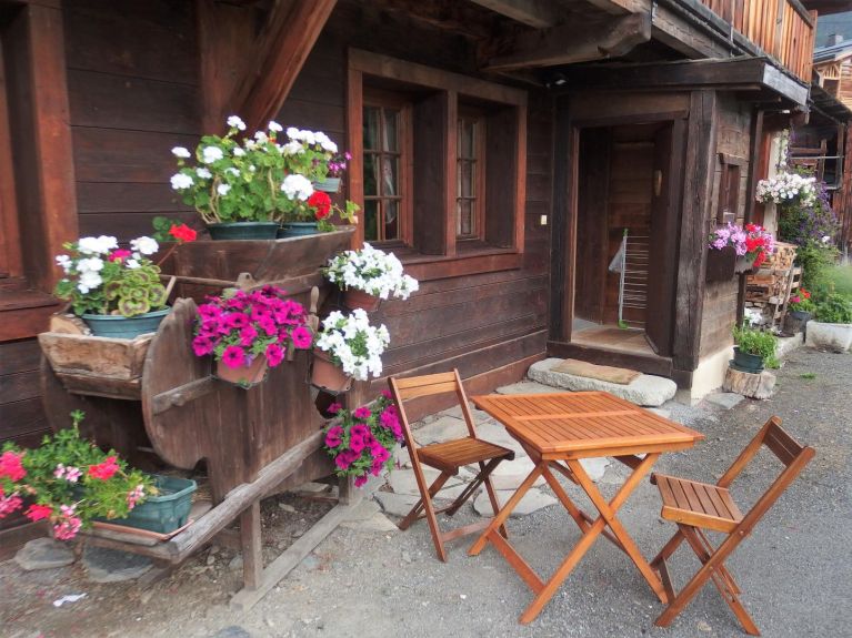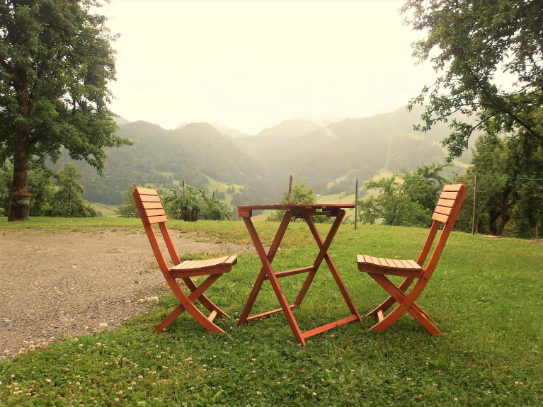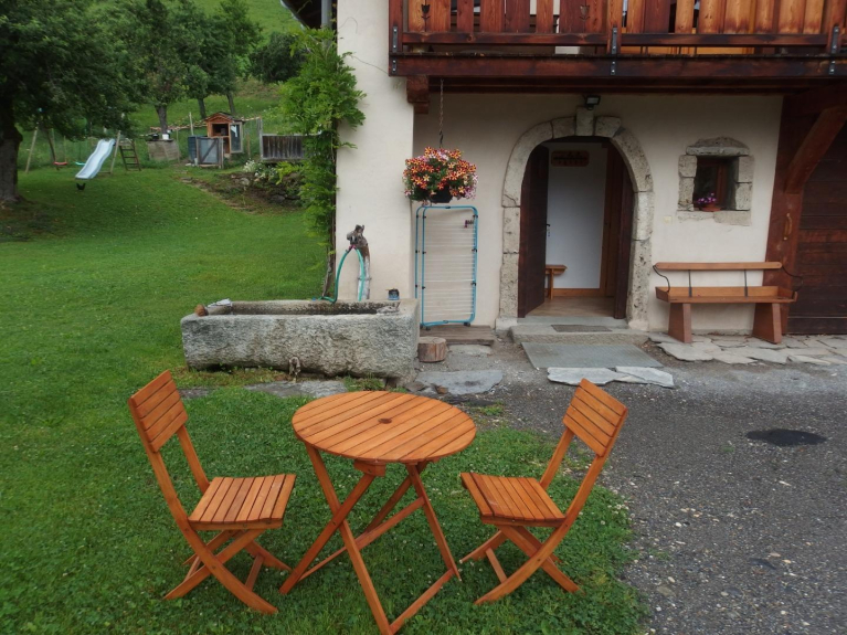 Molta ombra in estate, con tavolo da giardino, sicuro per i bambini, in quanto non c'è nessun attraversamento stradale, molto soleggiato in estate e in inverno, molto bella vista sulle montagne